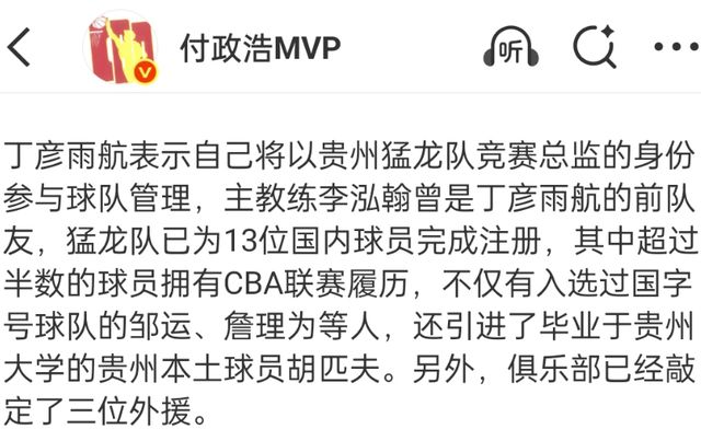根据媒体介绍,丁彦雨航是球队的联合创始人,另一位合作人是前广州龙狮的老总林葳,而球队主帅则是CBA名将,丁彦雨航昔日在山东男篮的队友李泓翰,新赛季贵州猛龙的目标就是冲击联赛四强,为此他们也引进了三名外援。